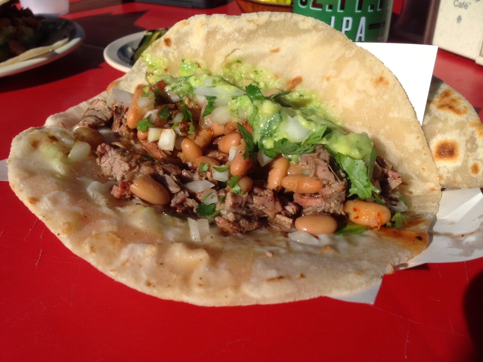 Taco Perrone from Tacos el Yaqui in Rosarito, Mexico - Located on a side street in Rosarito, this small, al fresco taco shop always has a line and features about 5 menu items, although they need only one. The Taco Perrone is consistently better than my fondest memories of its indulgence. It seems simple enough - a cook sits out front making carne asada all day on a small, wood burning grill, which eventually goes into some kind of sauce or broth in a stew pot. Place your order and a hot tortilla filled with melted cotija cheese (like a quesadilla) comes off the griddle, is peeled open and topped with the chopped steak. Then, it's topped with pinto beans, guacamole and an onion and cilantro mix. Roasted jalapeños and radishes are brought table-side for garnish. We've taken the 45 minute trek to Rosarito on a whim just for this taco. It may be the best ever. Feel free to bring your own beer (see that Stone Enjoy By IPA in the photo?)!