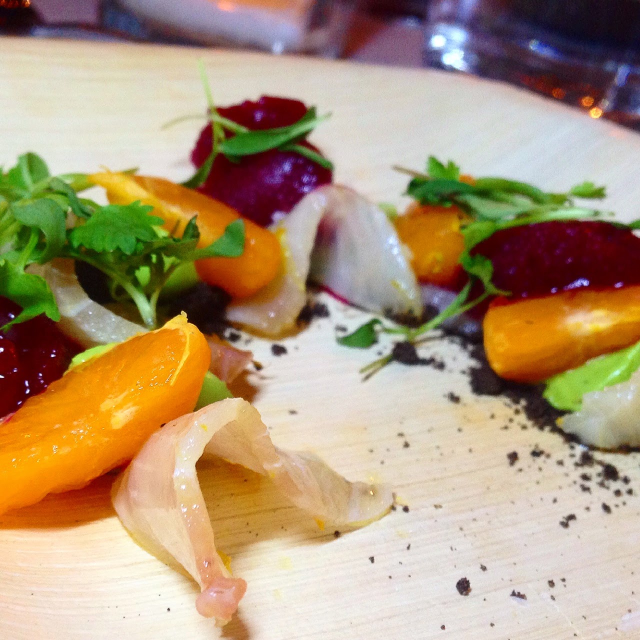 Cobia from Chef Ryan Carson at Dinner Lab Pop Up Supper Club - We were lucky enough to attend the inaugural Dinner Lab event in San Diego. One of our first courses was this denatured cobia (citrus juice cooked, like ceviche) with avocado, cilantro micro greens, tangerine, frozen beet and a crispy cocoa powder. It was amazing, unlike anything I've ever eaten. Harmonious. Glorious. Absolute culinary artistry.