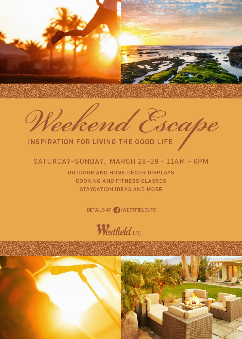 Want inspiration for living the good life? On the weekend of March 28-29, Westfield UTC will host its inaugural Weekend Escape - a two day discovery that celebrates San Diego’s vibrant outdoor lifestyle and aims to inspire the community to rejuvenate its health and fitness regimen, perk up its surroundings at home and rediscover the local landscape. Guests will enjoy free activities for the whole family throughout the center and Palm Plaza, including fitness and yoga instruction, cooking classes, staycation ideas, gardening tips, a pottery barn and more!