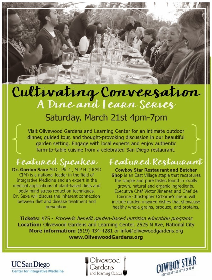 Olivewood Gardens and Learning Center will host Cultivation Conversation: A Dine and Learn Series event on Saturday, March 21, from 4-7pm. This intimate outdoor dinner will include four courses prepared by the staff from Cowboy Star, as well as a guided tour and thought-provoking discussion in Olivewood's beautiful garden setting in National City. Engage with local experts and enjoy authentic farm-to-table cuisine from a celebrated San Diego restaurant. Use promo code SDVILLE to save $5 on tickets to the event!