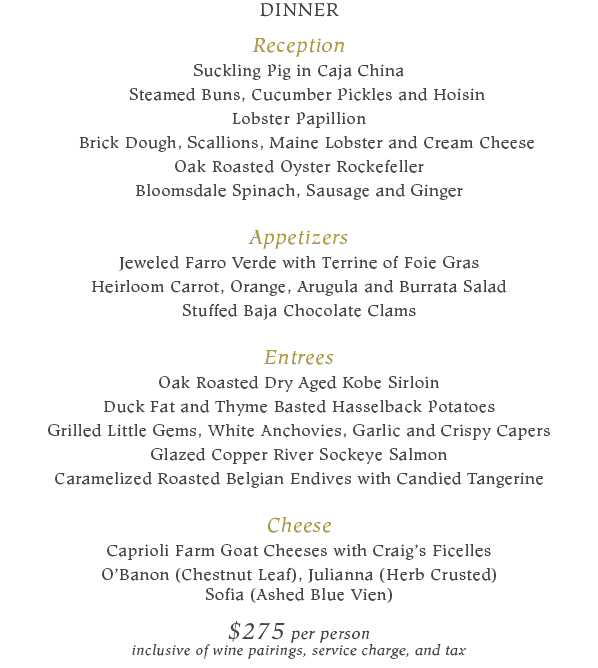 The James Beard Celebrity Chef dinner will begin at 6:30pm with a bountiful reception. Offerings will include suckling pig prepared in a Caja China box, steamed buns, lobster Papillion, oak roasted oyster Rockefeller and more. After the reception, diners will be seated and appetizers will be served including jeweled farro verde with terrine of foie gras, stuffed baja chocolate clams, and an heirloom carrot, orange, arugula and burrata salad. For the main course, there will be oak-roasted dry aged kobe sirloin, duck fat and thyme basted Hasselback potatoes, glazed copper river sockeye salmon and more! The meal will finish with a selection of rare cheese. Tickets to this once in a lifetime feast are available online at the cost of $275 per person, inclusive of wine pairings, service charge, and tax.