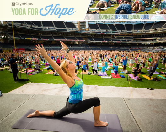 An anticipated 1,000 health conscience San Diegans will unite on Saturday, June 13 on the centerfield grass of San Diego Padres' Petco Park to practice yoga and show support of City of Hope, one of the nation’s leading centers for cancer treatment and research. Yoga for Hope is the largest yoga fundraiser in Southern California and proudly showcases San Diego’s premier yoga studios and wellness enthusiasts as they join together to raise funds for cancer research and raise awareness of the benefits of yoga. We have two tickets to the 5th installment of this worthwhile event. Read on for all the details and be sure to enter.