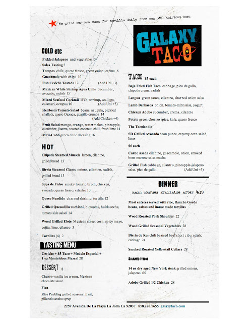 As for the bar menu, in addition to an ample selection of tequila and mezcal, there will also be Baja-sourced wines, a lengthy cocktail list and craft beers from San Diego and Mexico, including a beer brewed just for the restaurant - Galaxy Corn Lager made by Benchmark Brewing.