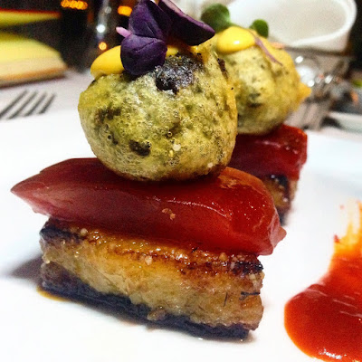 | One of the best dishes we have ever eaten - Chef Ivan's Fijian ahi yellowtail sashimi atop brown sugar and garlic-roasted pork belly capped off with a black garlic tempura ball |