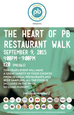 Enjoy some of the best eats in central Pacific Beach at the Heart of PB Restaurant Walk on Wednesday, September 9, from 4-9pm. Be sure to bring your appetite, as this popular annual event continues to grow and will offer a large variety of food choices (and a craft beer and cocktail sampling!) from over 15 restaurants as attendees enjoy a leisurely stroll between Everts and Lamont Streets - all for the ridiculously low $20 ticket price! This event is a legitimate value and always makes for such a fun evening, so gather your friends and family and get your tickets. We have 2 passes to give away so enter our raffle and read on to learn more about the event!