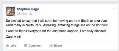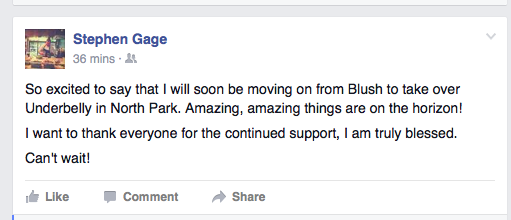 Chef Stephen Gage joined his friend and former La Valencia boss Daniel Barron to launch Blush Ice Bar in downtown San Diego this past July, but Gage will soon depart from his position as chef de cuisine of Blush to take the reigns as Executive Chef of Underbelly in North Park, joining the CH Projects family of restaurants.