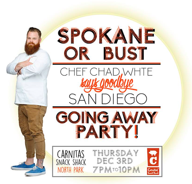 NOW LETS PARTY…Please join me Thursday, December 3rd from 7pm to 10pm at Carnita’s Snack Shack in North Park for my “Going Away” Party - Pop Up where I will be serving up good eats you’ve all come to enjoy over the years.