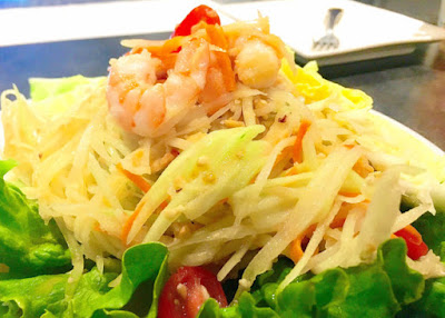 When our aromatic green papaya salad with shrimp was presented, we dove in and immediately declared it to be the most flavorful and tastiest version we had ever eaten, boasting deeply layered flavors, accentuated by fish sauce, spice and garlic. At the time, we hadn't realized that the woman we were dining next to at the bar was the owner.