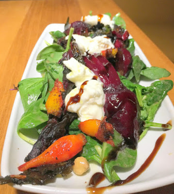 From the salad menu, we ordered the baby beet salad with red and gold beets, spinach, asparagus, lentils, garbanzo beans, burrata and a balsamic drizzle ($12). This hearty, meal-portioned salad was excellent and was one of the first times we saw the beets served roasted with stems on, as well as fried pieces of the leaves. We devoured the whole thing in all of its earthy glory.