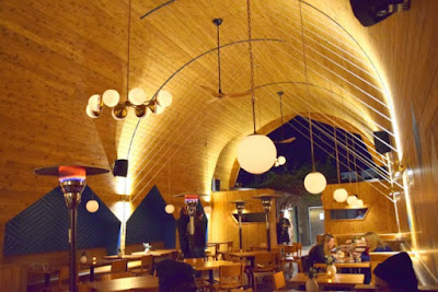 Taking over the former Lei Lounge, Madison transformed the space into a relaxing indoor-outdoor oasis. Upon entering the Victorian-era storefront, the restaurant presents a sophisticated bar and lounge area lined with plush booths. Just beyond the bar, the main dining room offers al fresco seating under a gorgeous vaulted, cedar-lined, archway ceiling. The musical background of the creative team inspired the design of the space. Rope installations, reminiscent of guitar or harp strings, are abound in the cavernous dining room, as well as partitioning the cozy booths in the bar area. The restaurant also boasts a top-of-the line sound system (imagine the acoustics!).