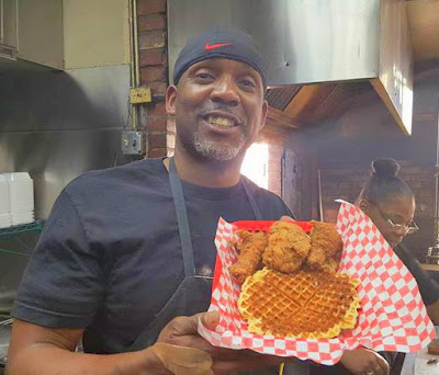 | Bradrick Cooper showing off his chicken and waffle |