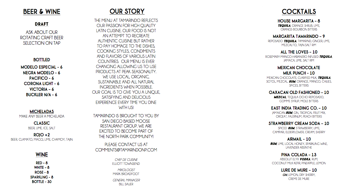 Tamarindo is located at 2906 University Avenue in San Diego's North Park and is currently open Sunday through Thursday from 11am-midnight and Friday & Saturday from 11-2am. For more information, visit tamarindonp.com and check out the menus below.