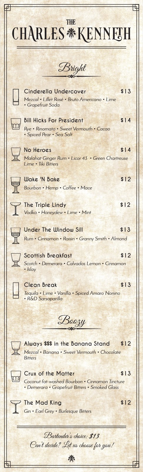 At The Charles Kenneth, expect a menu of classic cocktails reimagined. Favorites include Bill Hicks For President - with rye whiskey, Rinomato aperitivo, sweet vermouth, cacao, spiced pear and sea salt; Wake 'N Bake with bourbon, hemp, coffee and mace spice, and Always $$$ in the Banana Stand with mezcal, banana, sweet vermouth and chocolate bitters.