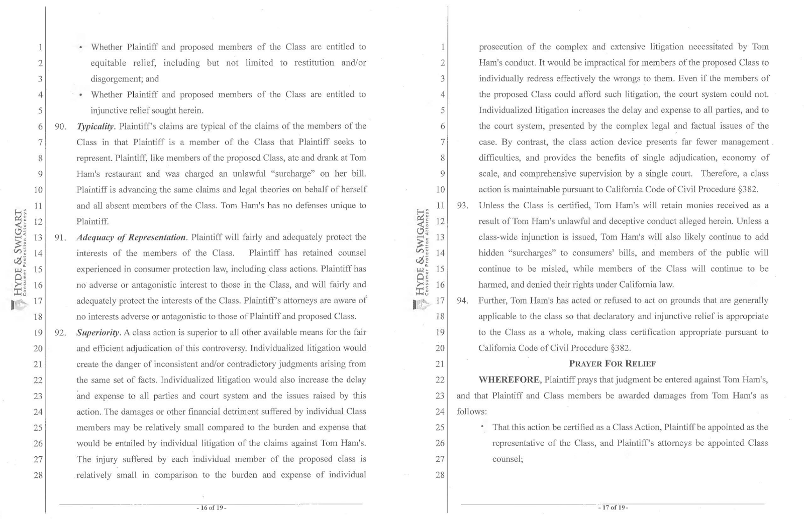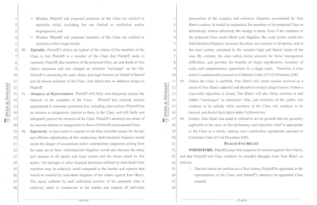 Some of San Diego's top restaurants - including George's at the Cove, Tom Ham's Lighthouse, Bali Hai, Sammy's Woodfired Pizza & Grill, and numerous Cohn Restaurant Group establishments - have been named as defendants in a case requesting to be filed as a class action suit brought on behalf of various plaintiffs by attorneys Kevin Lemieux and Robert Hyde from Hyde & Swigard law firm. The complaint states that the named restaurants violated California's False Advertising Law, Unfair Business Competition Law, and the California Consumers Legal Remedies Act by adding deceptive surcharges on customers' bills. The firm expects to file as many as 20 such lawsuits by the end of 2017.