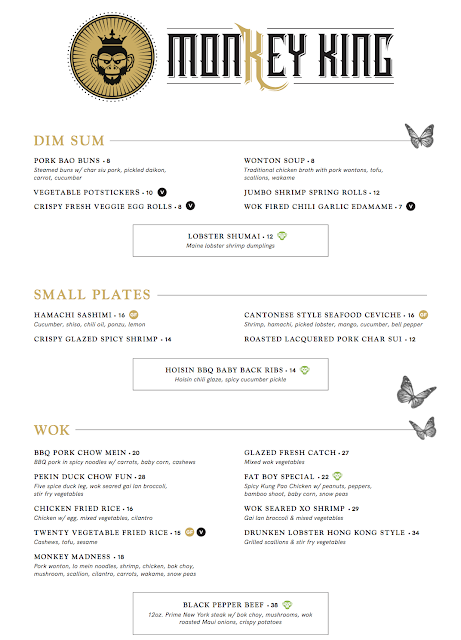 Monkey King now offers a new modern Chinese meets Asian-fusion menu composed of shareable items such as Drunken Lobster Hong Kong style - a whole 1-pound lobster served with grilled scallions and a classic red chili sauce. The casual restaurant also serves traditional house made dim sum, and caters to those less eager to share with dishes like Peking Duck Chow Fun and a 12-ounce Prime NY Strip served with a black pepper Sichuan sauce.