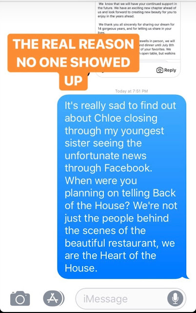After seeing an online Facebook post from Cafe Chloe co-owner Alison McGrath about a kitchen staff no-show on the evening of June 28, we noticed several other posts on various social media platforms from former employees who were upset that they were not given advanced notice of the impending closure prior to the social media announcement. We reached out to some disgruntled employees and had them pass along our contact information to others that may want to comment or provide further details and received an influx of messages (quotes are left as-is with typos) from at least five former employees. We also reached out to Ms. McGrath for comment, who explained that although manager Tammy Towner alerted front-of-house employees of the impending closure by text prior to the social media announcement, a "kitchen manager" was tasked with contacting back-of-house employees and failed to do so.