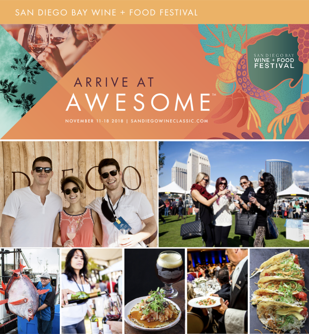 San Diego Bay Wine + Food Festival is Southern California’s largest food and wine festival, which welcomes 10,000 foodies annually, for a weeklong celebration of over 40 citywide events, including a Pitmaster's Veterans Day BBQ, a Speakeasy Opening Night Party, a Baja expedition, an Oysters + Caviar pairing event, a Pรขtรฉ + Charcuterie presentation at Born & Raised, a Sake symposium, a Ceviche showcase, a Taco competition, and, of course, the Grand Tasting Festival with tastes from over 60 celebrity chefs and restaurants, hundreds of domestic and international wine, beer and spirit purveyors and gourmet food companies amidst a stunning coastal backdrop with sail boats floating by. Hundreds of domestic and international wineries, breweries and spirits headline the festival, including Louis Latour, Dom Perignon, Vins de Provence, Stella Artois, Groth Vineyards, Grgich Estates, Banfi Vintners, Kistler, Bonny Doon Vineyard, Campari, Gloria Ferrer, Loire Valley Wines, Rias Baixas, Glenfiddich, Monkey Shoulder, Woodford Reserve, and hundreds more.