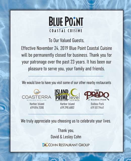 Cohn Restaurant Group's Blue Point Coastal Cuisine has been one of Downtown San Diego's go-to seafood spots for 24 years, but the restaurant closed this week and the space is set to be taken over by another familiar San Diego restaurateur.