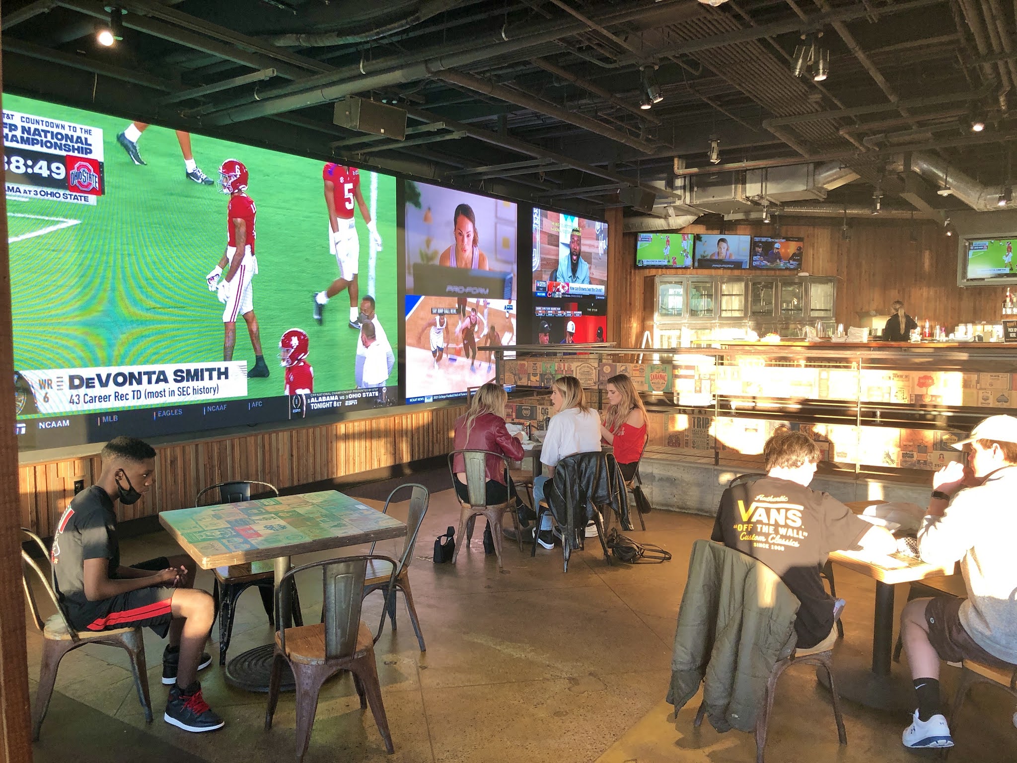 Following reports from tipsters that Belmont Park was hosting diners both inside and out at its restaurants over at least the past week, we visited the amusement park on Monday, January 11, and witnessed diners eating and drinking at both Draft Mission Beach and The Beach House (previously The Wave House). Draft was even hosting diners inside the restaurant and had the NCAA College Football National Championship game playing on their 31 foot LED big screen. Although many San Diego eateries are defying the regional stay-at-home restrictions, Belmont Park is unique it that the property is owned by the City of San Diego. Since 2012, Pacifica Enterprises LLC leases the park and oversees most of the businesses.